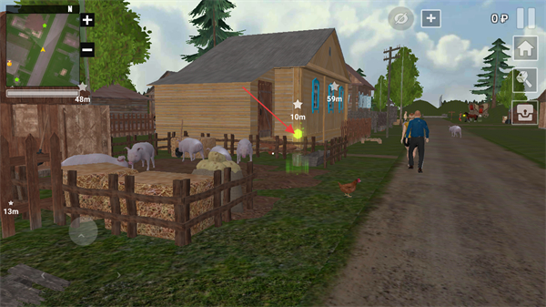 1、这是农场模拟类游戏的乡村场景界面,通过左下角移动键操控角色移动,推进游戏任务流程。