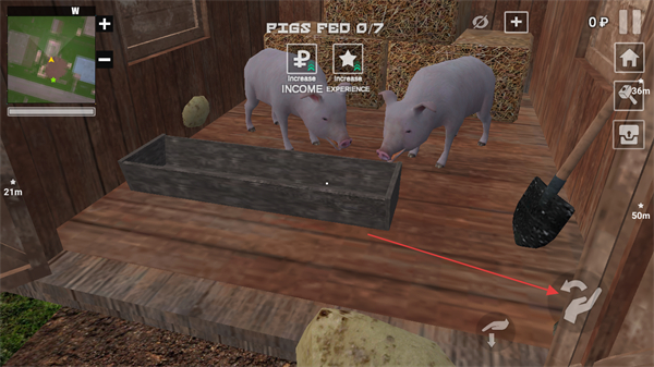 4、点击右侧的按键将拾取的饲料放入猪栏内的食槽中,完成猪的喂食,逐步推进任务的进度。