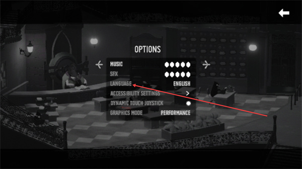2、这是死亡之门的OPTIONS界面,可调整MUSIC、SFX等设置,找到LANGUAGE选项即可准备切换游戏的显示语言。