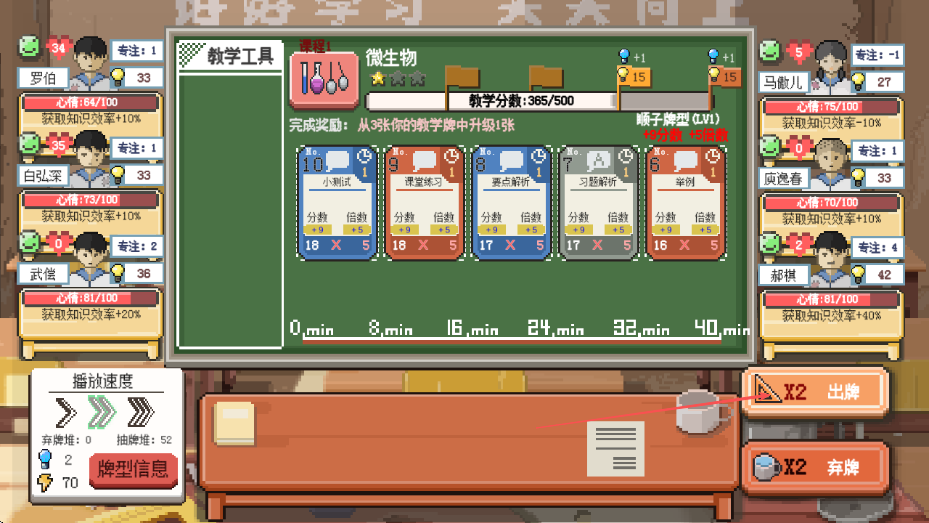 4、完成规划后点击出牌按钮,执行教学安排,提升学生知识获取效率和教学分数,推进游戏进程。