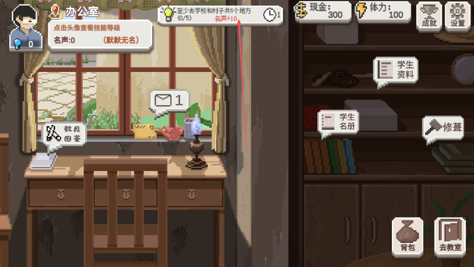 1、在办公室界面留意任务提示,像至少去学校和村子5个地方,完成可获名声,点击头像查看技能等级。