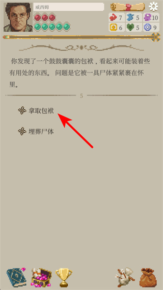 1、点击红色箭头指向的夺取包袱选项,可尝试从尸体处获取道具,会显示对应消耗的行动点数,消耗后会触发道具获取的判定流程。