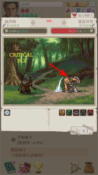 4、按照红色箭头指引,观察战斗界面中的CRITICAL标识如显示38.2,这代表当前攻击触发了暴击效果,会对敌方造成更高的伤害。