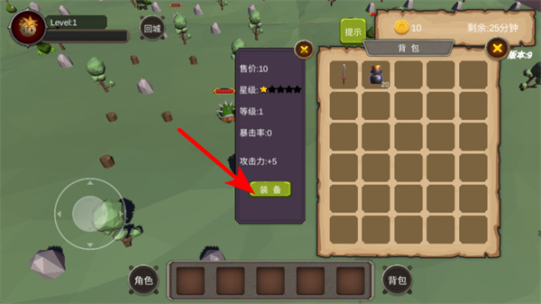 4、击败敌人后拾取掉落的道具,打开背包界面查看道具属性,点击装备按钮穿戴增益道具,提升角色的战斗能力,为后续关卡的挑战积累优势。