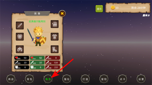 1、在游戏界面点击角色按钮进入装备界面,查看当前角色的属性数值与可穿戴装备,优先搭配能提升攻击力或防御的道具,为战斗做好基础准备。