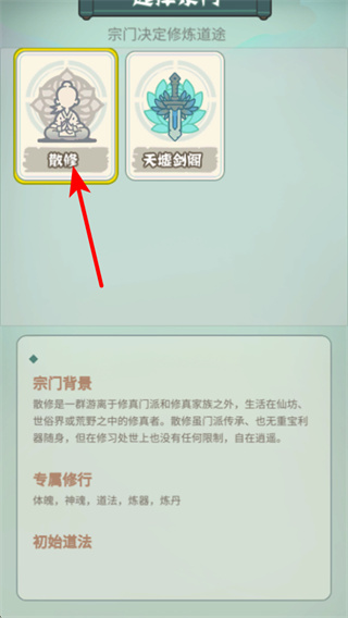 2、进入宗门选择界面后,选定对应的宗门类型如散修,这是确定修行方向的基础操作,对应不同的修行体系与成长路径。