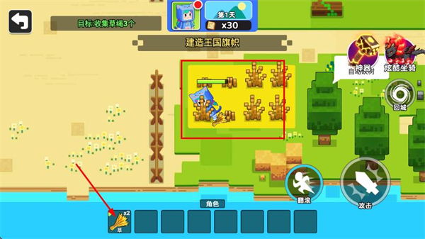 3、进入像素世界场景,在黄色区域收集草类资源,完成任务所需的物资收集。