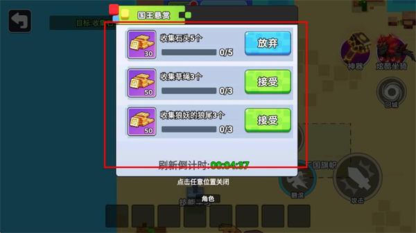 2、在国王悬赏界面,选择可完成的任务,点击接受按钮,领取任务目标。
