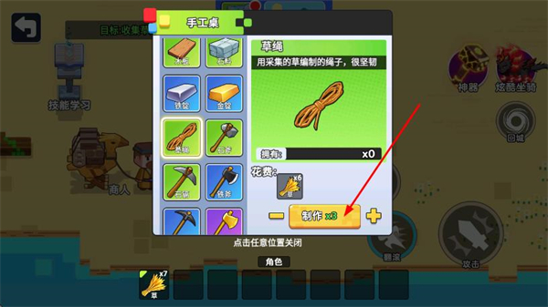 4、打开手工具界面,消耗收集的草资源,点击制作合成草绳,即可完成任务。