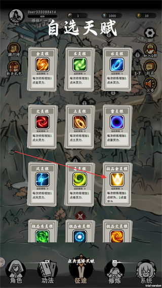 2、在自选天赋界面里,选择极品金灵根这类天赋,其效果是每次修炼增加对应灵力,选后推进角色养成。