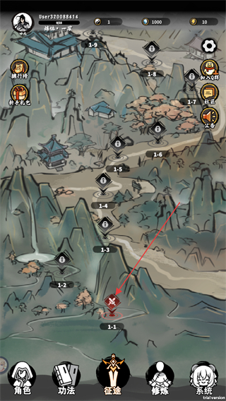3、在征途界面找到1-1关卡的标识,点击该标识就能进入对应的关卡,开启该关卡的挑战进程。