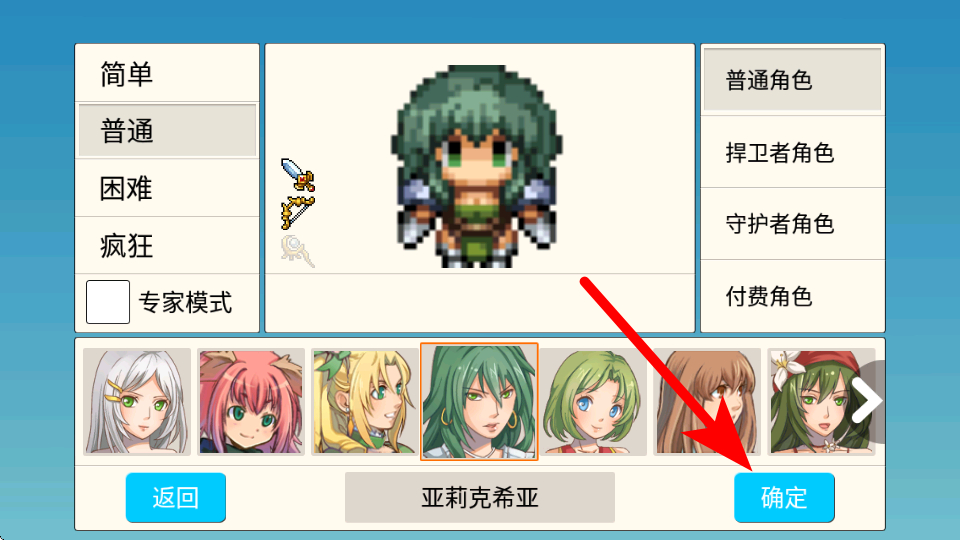 1、在角色选择界面,选定难度和角色后,点击确定开启冒险,这是进入游戏的关键操作。