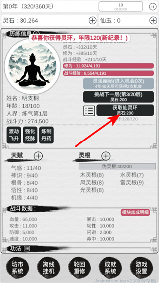 3、在历练界面,点击获取新灵环可解锁新的灵环加成,提升自身的属性如灵气、战力,强化后续战斗、挑战的能力。