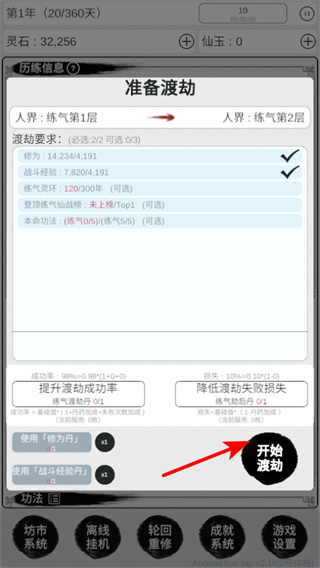 4、满足渡劫条件后,点击开始渡劫可冲击更高修仙境界,会提升境界等级如炼气期2层,解锁修仙功能与挑战内容。