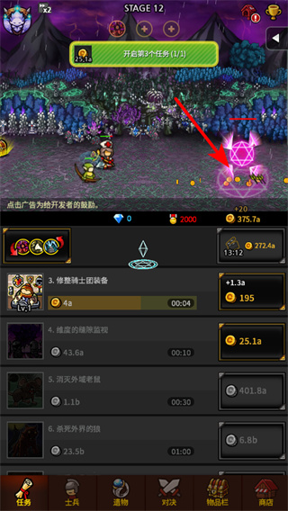 1、点击红色箭头指向的紫色水晶,可获取进化所需的资源,这是积累进化材料的关键操作。