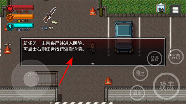 2、留意新任务提示,如击杀丧尸并进入医院,点击右侧任务按钮可查看详情,明确目标。