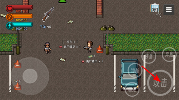 3、遇到丧尸时,点击攻击按键,可使用武器对丧尸发起攻击,逐步完成击杀任务。