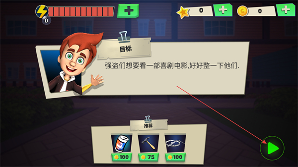 1、在目标界面,根据任务如给强盗播放喜剧电影整蛊他们,选择道具如汽水、锤,点击绿色开始按钮进入关卡。