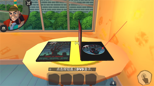 4、找到恐怖DVD后,点击按钮盖上DVD盒子,完成物品收集,进而推进剧情,完成整蛊盗贼的任务。