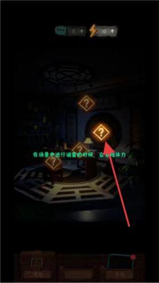 2、在场景探索时,点击带有?标识的地方进行调查,每次调查会消耗体力,仔细搜寻每个角落,不放过任何细节,为后续解谜积累信息。