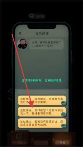 4、点击屏幕下方手机图标,与匿名顾客等角色对话,每次对话消耗对话值,通过合理选择对话内容,获取任务提示和关键线索推进剧情。