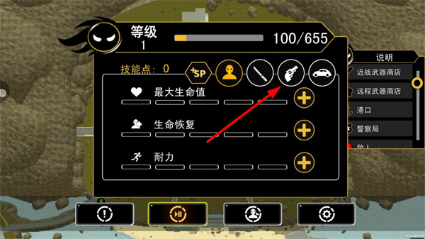 2、在地图界面,点击下方人物图标,进入等级与技能界面。