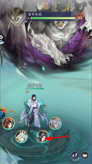 3、战斗中点击红色箭头指向的角色头像,可切换出战角色,调整阵容来应对敌方金目天虎的攻击。
