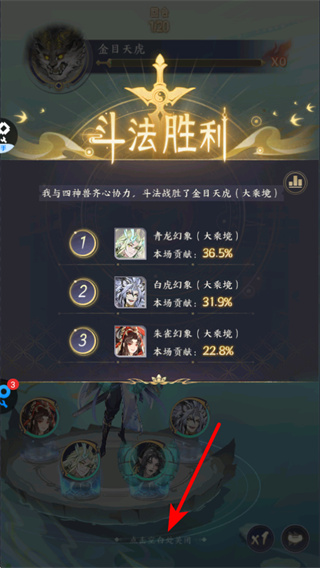 4、战斗胜利后,点击红色箭头指向的按键,可关闭结算界面,继续推进后续的游戏剧情。