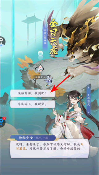 2、与神秘少女对话时,选择红色箭头指向的说话算话,我到吧选项,可同意其请求并推进剧情。