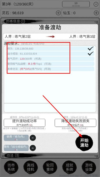2、确认角色渡劫要求达标,点击开始渡劫完成突破。