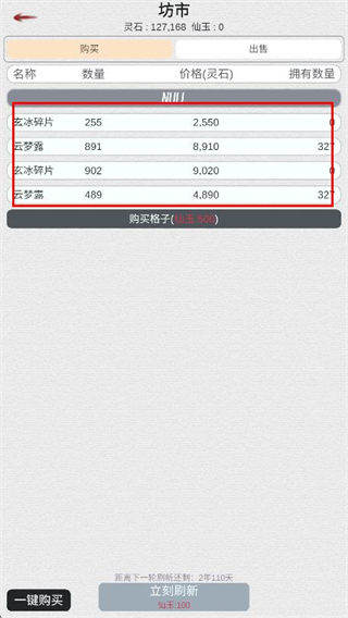 3、打开坊市系统,可以购买材料,用于辅助修炼。