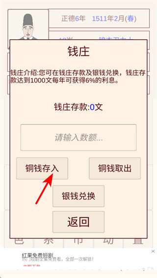 4、在钱庄界面点击铜钱存入按钮,可将铜钱存入钱庄获取利息,积累游戏内的货币资源。