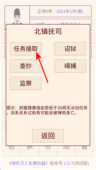 2、游戏中在北镇抚司界面点击任务接取按钮,可获取对应的任务,推进角色的职务进程。