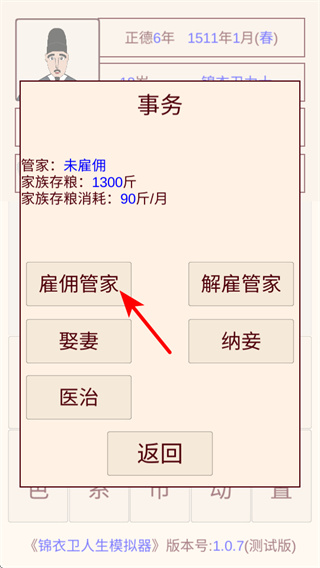 3、按照箭头指引,在事务界面点击雇佣管家按钮,可招募管家协助管理家族事务,降低压力。