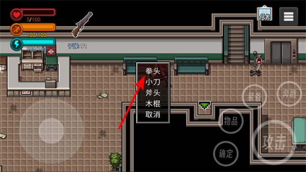 2、面对敌人时,可选择拳头小刀等武器进行攻击,根据战斗场景灵活切换。