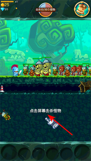 1、游戏中点击屏幕可击杀怪物,点击时需关注怪物的分布,优先击杀靠近的怪物以快速推进关卡。