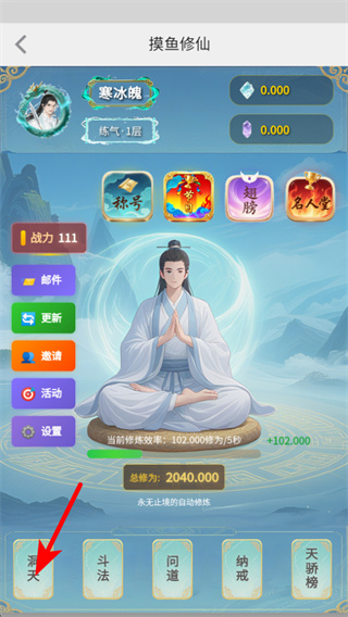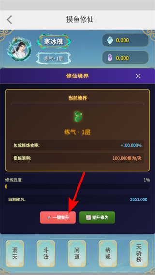 3、在修仙境界界面,点击一键提升按钮消耗修为值提升境界,境界提升可解锁更强的属性加成与功能,推进境界突破强化角色。