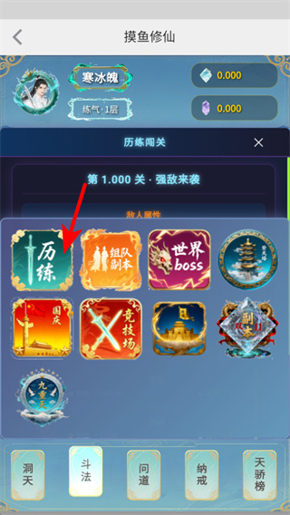 2、进入历练闯关界面后,选择历练功能参与关卡挑战,通过闯关可获取资源与历练进度,这是积累修仙资源的核心方式之一。