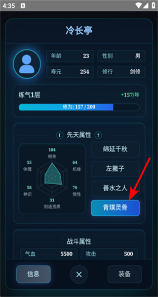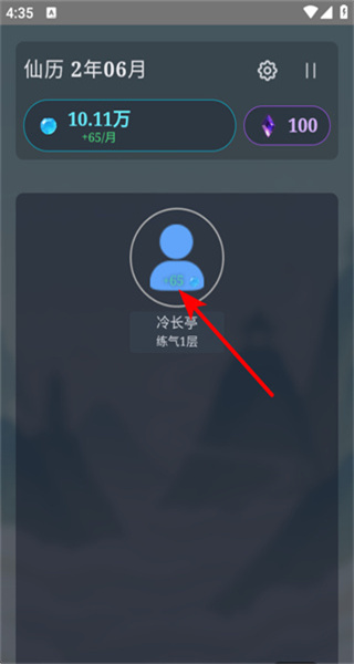 3、在主界面点击红色箭头指向的角色头像,可打开角色详情界面,查看当前的修行境界与属性状态。