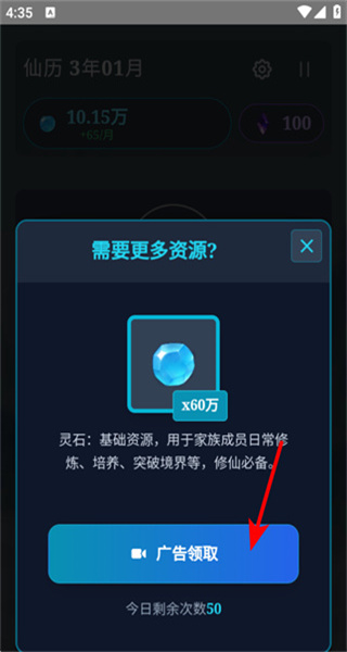 4、当弹出资源获取提示时,点击红色箭头指向的广告领取按钮,可获得60万灵石,补充修行资源。