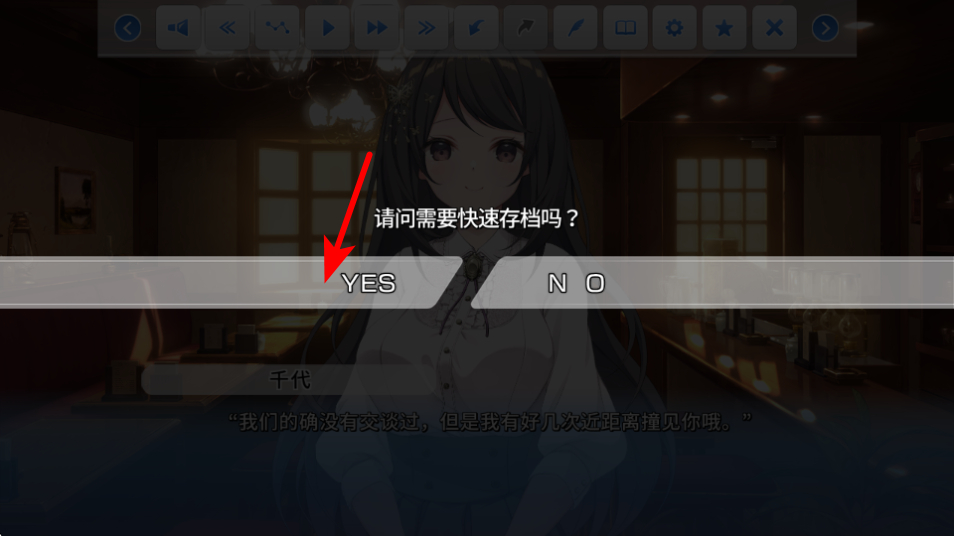 2、当弹出请问需要快速存档吗的提示时,点击红色箭头指向的YES选项,即可完成快速存档操作。
