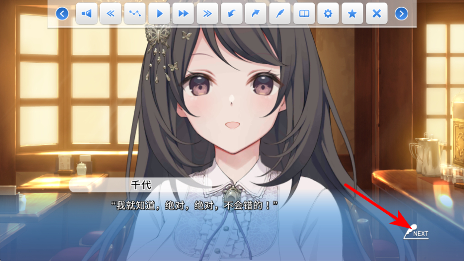 4、对话暂停时,点击红色箭头指向的NEXT按钮,能继续推进剧情,查看后续的角色互动内容。