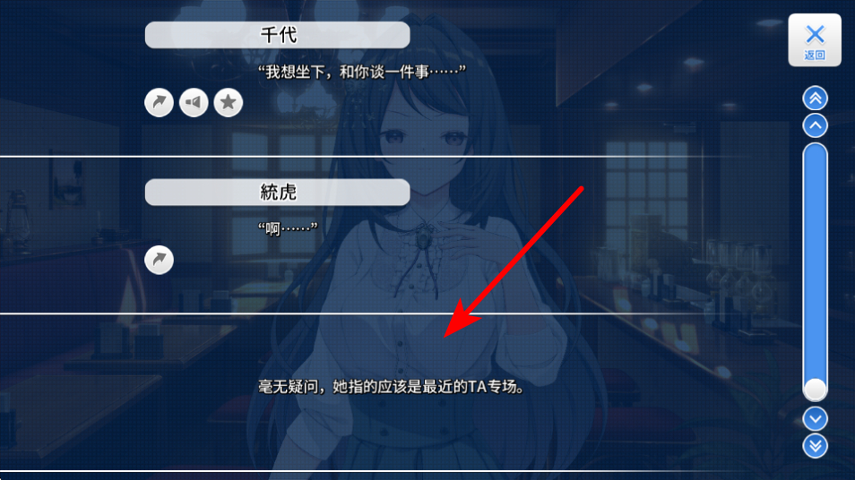 3、在剧情对话界面,可通过红色箭头旁的滑动条调整对话显示区域,查看完整的剧情文本内容。