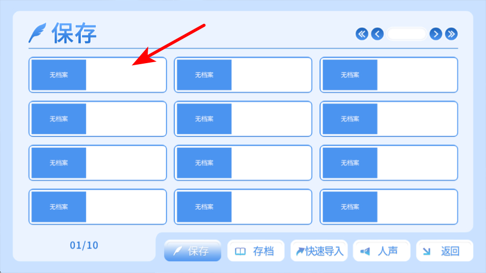 1、在存档界面,选择红色箭头指向的无档案存档位,可将当前游戏进度保存至该位置,避免进度丢失。