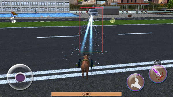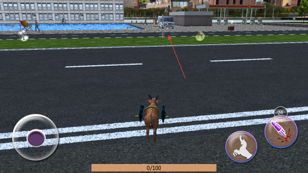 1、点击继续按钮进入城市场景,此时屏幕左下角会显示方向操控键,右下角有跳跃按钮,先通过方向键控制山羊在街道上移动,熟悉布局并尝试点击跳跃按钮让山羊越过路边障碍物。