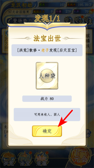 3、当法宝出世的提示界面弹出时,点击确定按钮,这是获取法宝并提升战力的核心操作,确认后法宝会加入势力体系,增强整体的战斗能力。