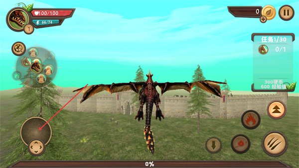4、进入游戏主场景后,用左侧移动按钮操控龙移动,完成右侧任务1/30的目标以获取硬币和经验值。
