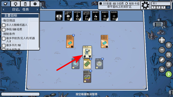 2、卡牌操作,空格暂停,卡牌堆叠是核心,资源卡+建筑卡可合成防御设施,资源卡+科研卡能解锁高级科技。
