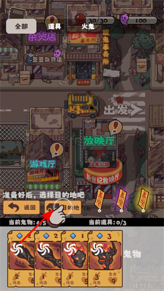 2、准备好鬼物后,点击目的地按钮,可进入地图选择界面,这是开启冒险旅程的关键操作。