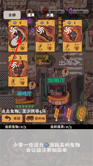 1、在鬼物选择界面,点击卡牌将其编入队伍,至少携带4只鬼物才能出发,是冒险基础准备。